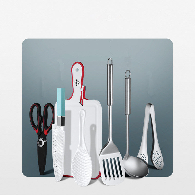 Material: Stainless steel Color classification: 7-piece cookware set (Navy Blue) 7-piece cookware set (Gray) Storage bag specifications: 36.5*21.5cm Included kitchenware: spatula / pot spoon / clip / scissors / kitchen knife / cutting board / rice spoon